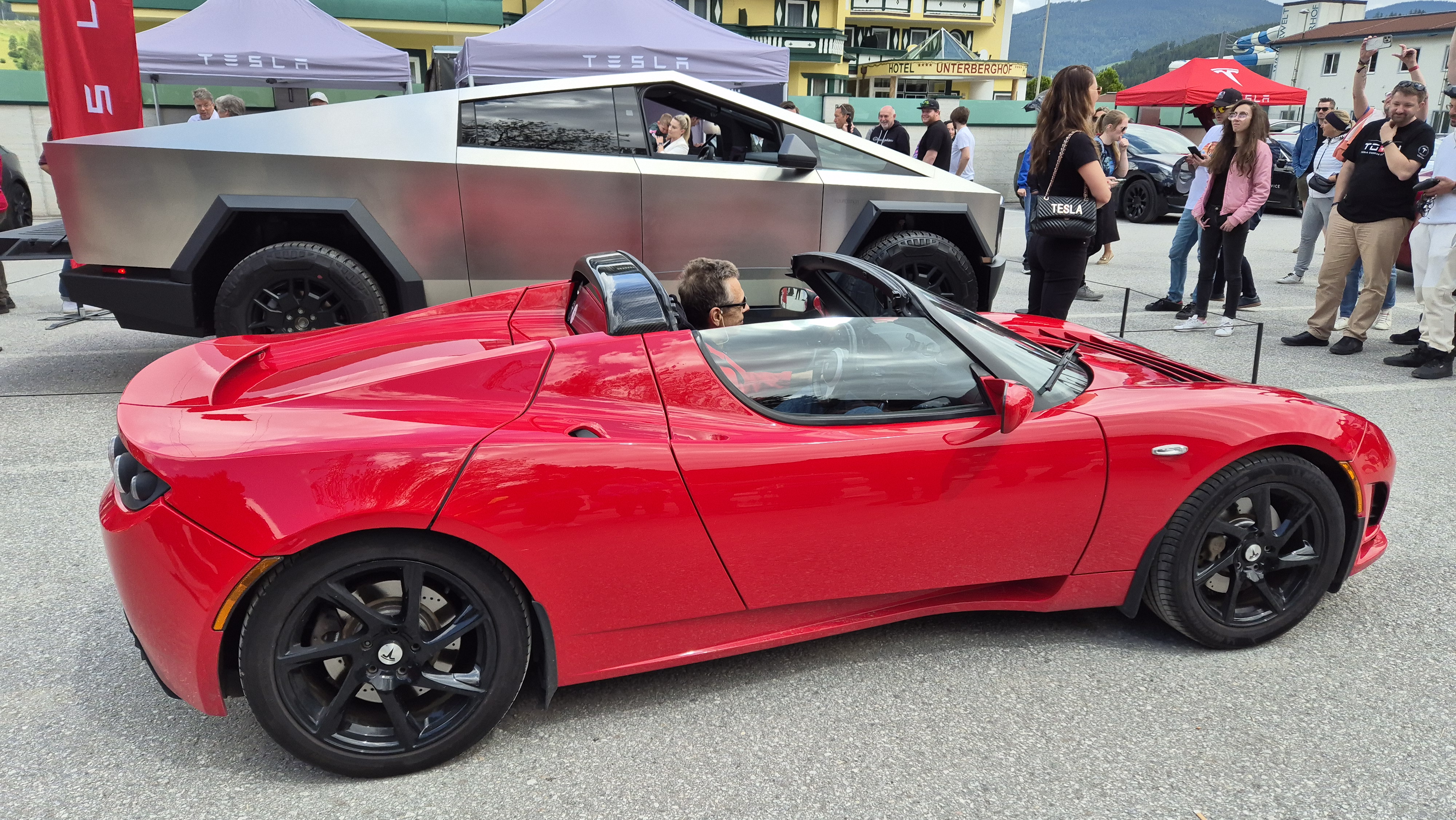 ... og vi fik set Tesla Cybertruck, der ankom om søndagen. Den holdt ved siden af den italienske præsident Lucas Roadster og det er lige ved at man kunne putte Roadsteren ind bagi CyberTrucken...
