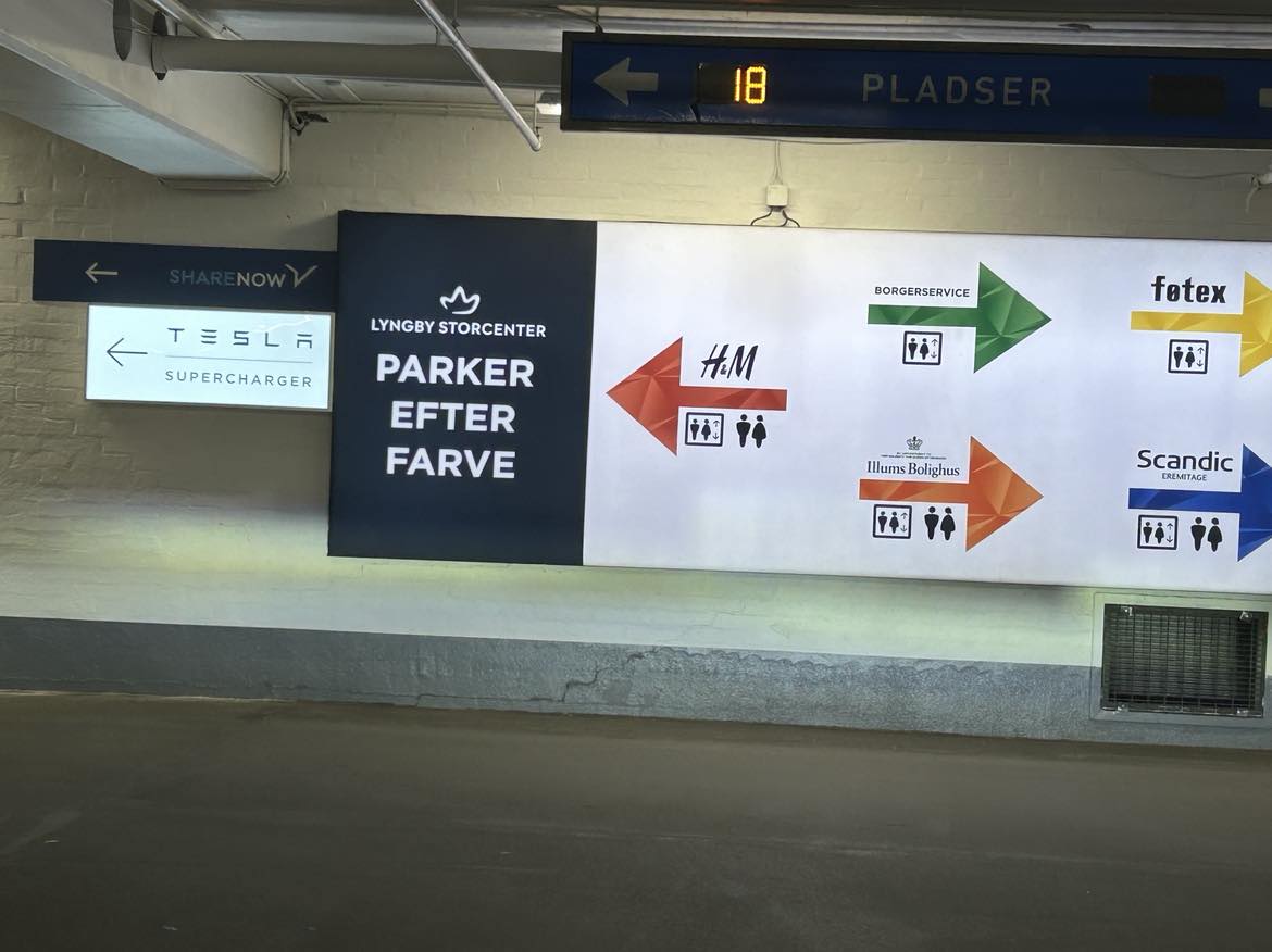 Tesla har nemlig her til aften åbnet sin længe ventede SuperCharger i Lyngby centeret. Der er opført 12 ladere, som er placeret i øverste kælder, i rødt område. Række 1, 2 og 3.